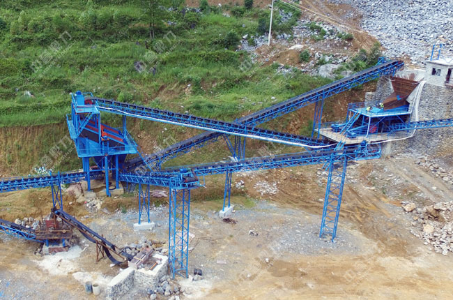 配置介紹:該方案是我公司2017年為廣西河池某石料廠設計配置,選用時產300噸左右的1512重錘破,可以一次將原料石灰石破碎成型,通過3層振動篩篩分出1-3、1-2、0-5多種規格的石料。