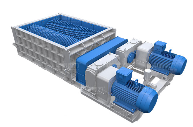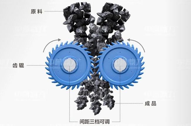 雙齒輥破碎機在工作時,物料進入破碎腔,通過高速旋轉兩齒輥對物料進行剪切、擠壓、拉伸等作用對物料進行破碎,齒輥中心距三擋可調,保障出料粒度。