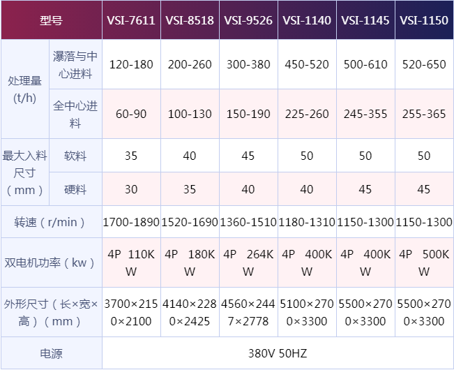 vsi沖擊式制砂機有好多種不一樣的規格型號,而每種型號的打沙機搭配的電動機、機械的轉速、所能解決的物料的粒度范圍和機械的總重量等是不一樣的,技術參數是用戶選購機械時的重要參數資料,關于vsi沖擊式制砂機的詳細參數請看下文技術參數表。