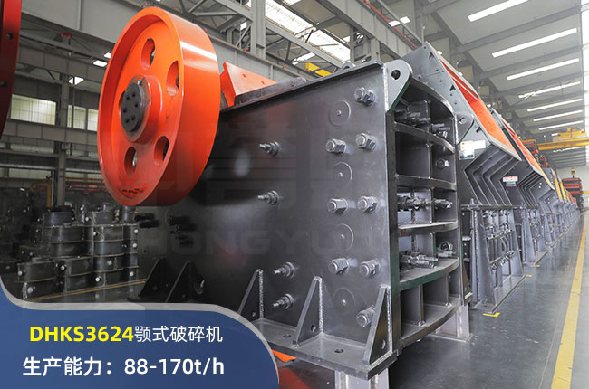 DHKS3624顎式破碎機進料口尺寸920×600mm,進料粒度510mm,出料大小65-130mm,電機功率75kw,時產可達170噸左右。