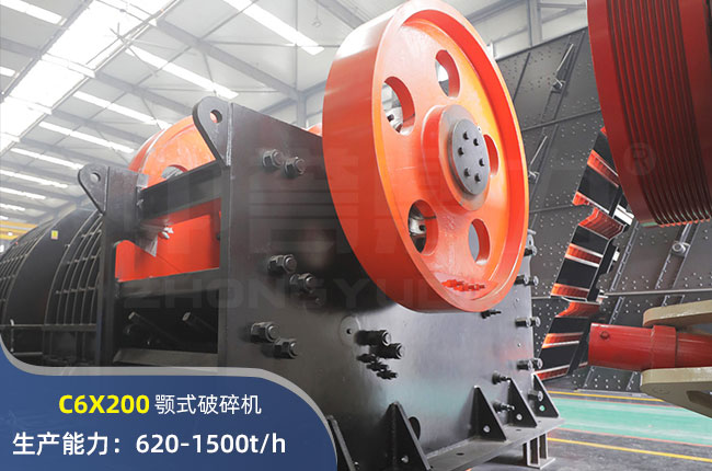 C6X200顎式破碎機進料口尺寸1500×2000mm,進料粒度≤1500mm,出料大小≤175mm,電機功率400kw,時產量在1500噸左右。