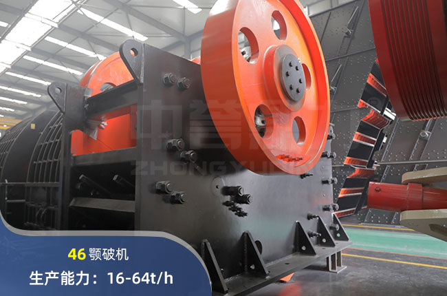 46破碎機每小時產(chǎn)量16-64噸,設(shè)備進料尺寸為400x600mm,可破粒度小于340mm的花崗巖,石灰石,玄武巖等硬度小于320兆帕的各種巖石。