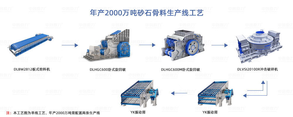 年產2000萬噸砂石骨料生產規模較大,投資大,根據破碎物料差異,以粗碎主機為主有錘破方案、鄂破方案、旋回破方案,各具優勢。