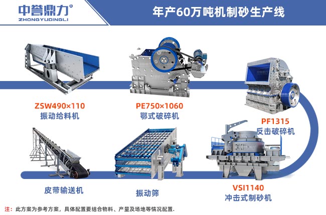 設(shè)備配置:ZSW490×110振動給料機(jī)、PE750×1060顎式破碎機(jī),PF1315反擊式破碎機(jī),VSI1140制砂機(jī),振動篩,輸送機(jī)若干。