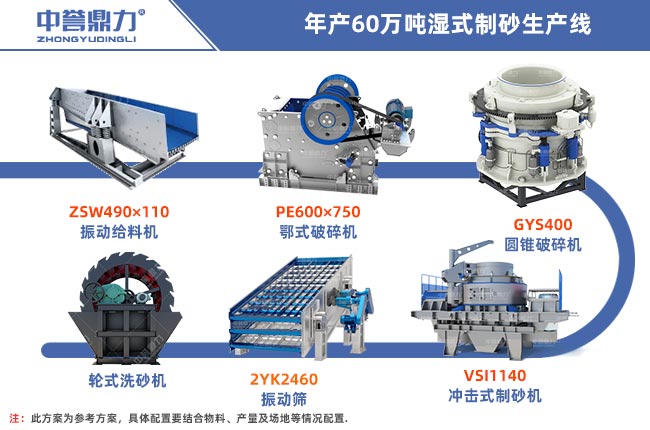設(shè)備配置:ZSW490×110振動給料機(jī)、PE600×750顎式破碎機(jī)、GYS400圓錐破碎機(jī)、VSI1140制砂機(jī)、2YK2460振動篩、XS3020洗砂機(jī)、輸送機(jī)若干。