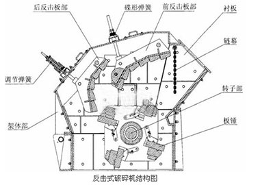 結構組成:反擊式破碎機主要由破碎機轉子、主軸、破碎板錘、反擊板、反擊彈簧裝置、反擊護板等主要部件組成。