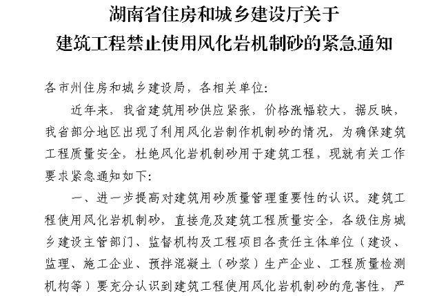 《關于建筑工程禁止使用風化巖機制砂的緊急通知》中,為建筑工程質量安,要杜風化巖機制砂用于建筑工程。