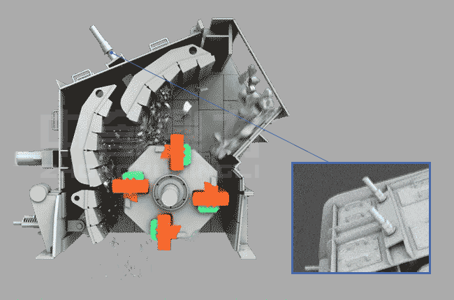 反擊破碎機(jī)出料大小在15~40mm以下,可通過(guò)調(diào)整反擊架和板錘間的距離,控制破碎粒度大小(即出料大小)。