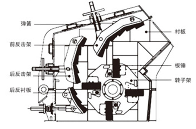 1214反擊破結(jié)構(gòu)由板錘、轉(zhuǎn)子架、襯板、彈簧、反擊架、反擊襯板等組成。