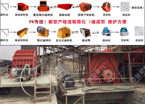 一條完整的沙石場(chǎng)生產(chǎn)線的主要設(shè)備包括爆破開(kāi)采設(shè)備、給料設(shè)備、破碎篩分設(shè)備,皮帶輸送設(shè)備、制砂設(shè)備以及成品輸送設(shè)備等。在不同的石料生產(chǎn)線中,所用到的給料設(shè)備、篩分設(shè)備、皮帶輸送設(shè)備基本上是可以通用的,但是破碎設(shè)備和制砂設(shè)備卻是可以選擇的。傳統(tǒng)的破碎設(shè)備一般由顎式破碎機(jī)和反擊式破碎機(jī)兩級(jí)破碎組成,但是在針對(duì)石灰石、煤矸石等抗壓程度低于200Mpa的中硬度石料時(shí),我們新鄉(xiāng)鼎力礦山設(shè)備有限公司研發(fā)并生產(chǎn)的重型錘式破碎機(jī)因其設(shè)計(jì)合理,錘盤(pán)大,錘頭重等結(jié)構(gòu)優(yōu)勢(shì),可以“一破頂兩破”,一次成型,為客戶了35%的成本。下面我們以石灰石為例,簡(jiǎn)單的說(shuō)一下整個(gè)沙石場(chǎng)設(shè)備生產(chǎn)流程。