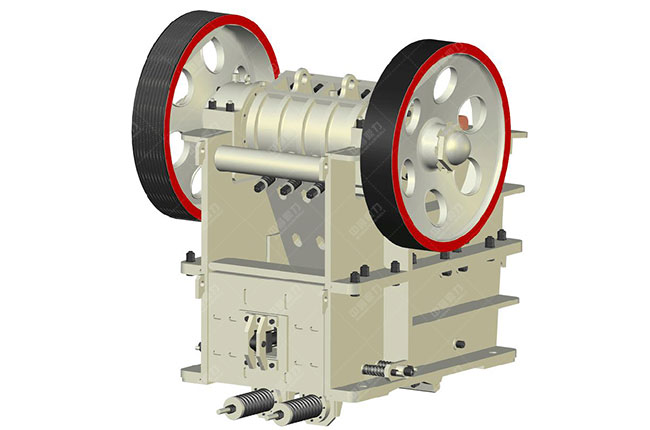 復擺顎式破碎機的動鄂直接懸掛在偏心軸上,動鄂底部由推力板一端支撐,推力板另一端支撐在于機架后壁相連的楔形調整機構的楔鐵,在偏心軸兩端裝有飛輪和帶輪(此時起飛輪影響);飛輪輪緣上的配重用以部分地均衡連桿在運動時所出現的慣性力,碎石機的出料口設計是可調的,調整楔鐵上的螺絲可取得所所需的出料口尺寸。