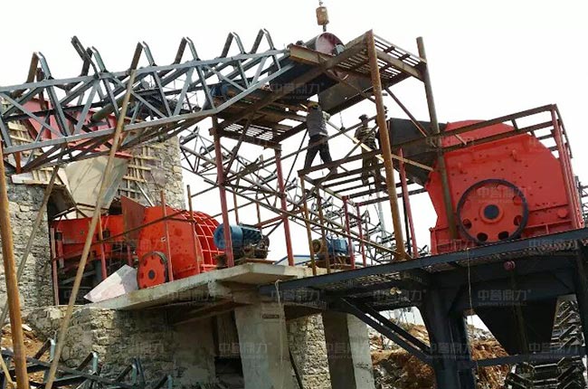 石灰石原料通過給料機(jī)均勻?qū)⒃哆M(jìn)PCZ1615重型錘式破碎機(jī)中,破碎后的石料會(huì)經(jīng)過振動(dòng)篩篩選,篩分出成本規(guī)格的石料,會(huì)有一部分回料,回料會(huì)返回PCX1213整形破中進(jìn)行再次破碎,然后再次通過振動(dòng)篩篩選分級(jí)。