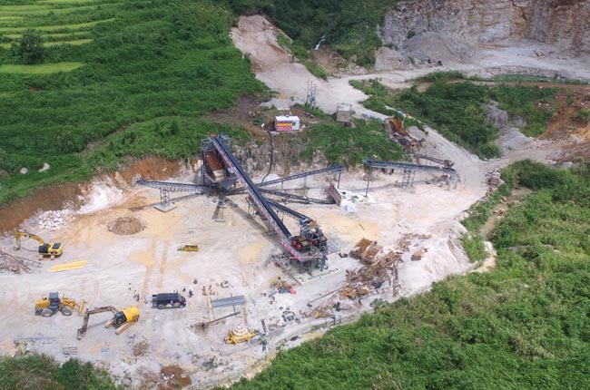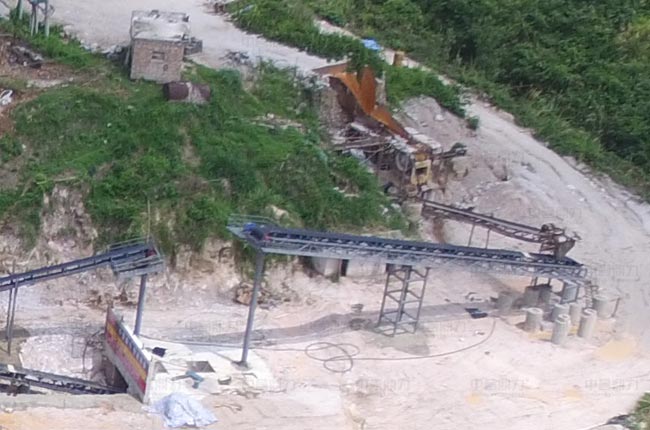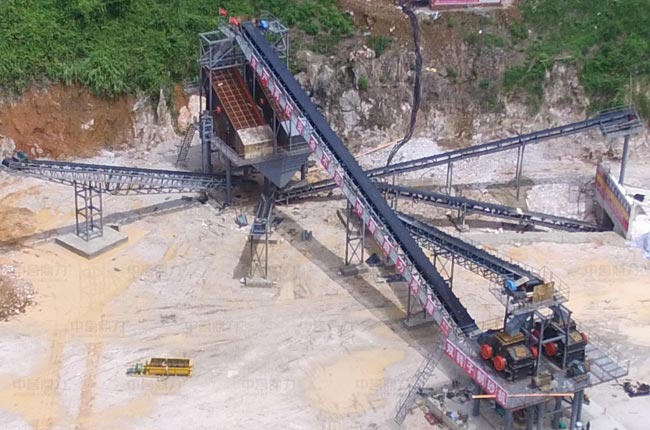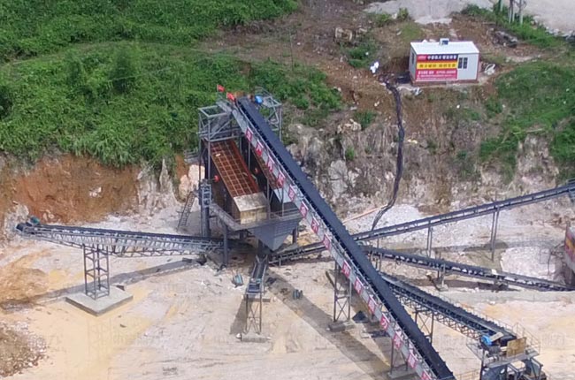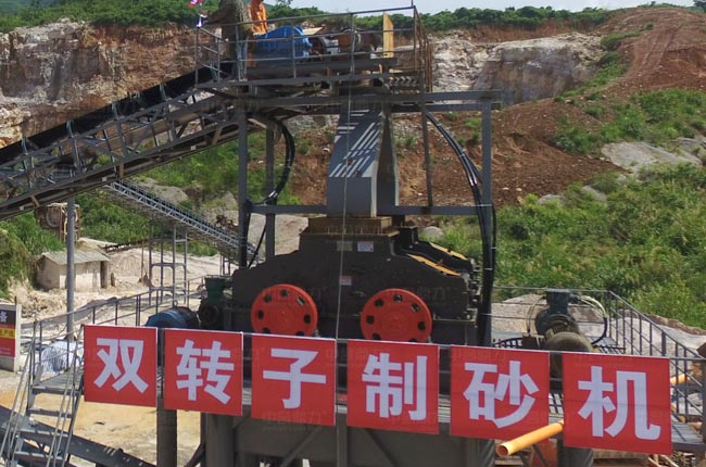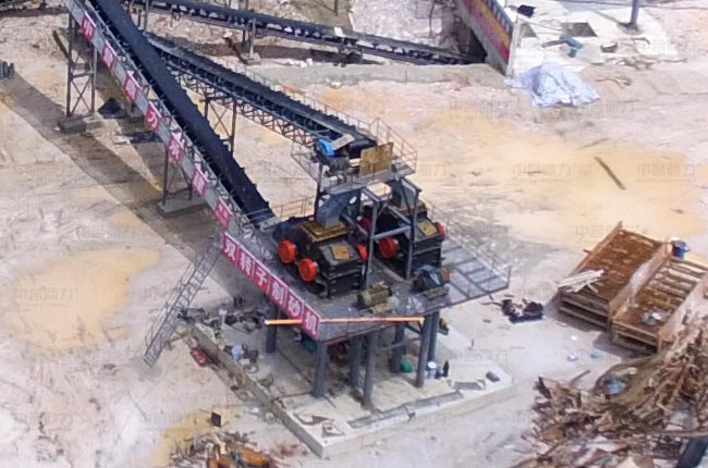 湖南抗應洞采石場時產300噸機制砂生產線采用500*750顎破機對物料進行粗碎,通過皮帶機送至中轉料堆,其后再通過皮帶機將碎石料送至兩臺ZSJ1213雙轉子制砂機細碎制砂,然后通過兩臺3YKZ2470振動篩篩分,頭層篩網石料會通過皮帶機送至中轉料堆再次通過制砂機加工,其余石料根據成品皮帶機送至相應的成品料堆。