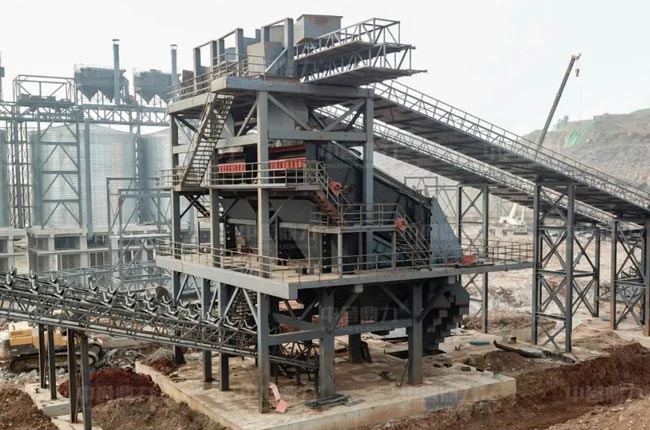 該項目設計為單臺大型1820重錘破加兩臺1622整形破,在1820重錘破后設有中轉料倉,粗碎后的石料在此緩沖后進入兩臺1622整形破中細加工,之后通過兩道篩分系統篩分石料,將不同規格的石料通過皮帶機送至儲料倉。