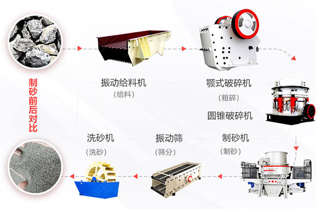大型:喂料機(jī)+顎破機(jī)(初級(jí)破碎)+圓錐石子機(jī)(二破)+制砂機(jī)械+洗石機(jī)(選配)+篩機(jī)