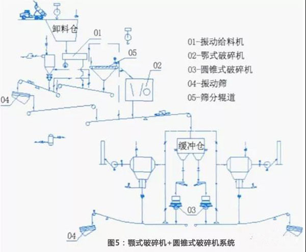由顎式破碎機、圓錐式破碎機和篩分系統組成,見圖5。