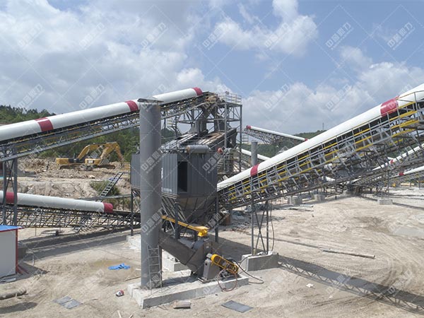 石頭由振動送料機均勻地送入顎破進行粗碎,粗碎后的石頭由皮帶運輸機送入到破沙機進行深度破碎,整型破碎后的石頭被運輸到篩機進行篩選分級,符合成品粒度要求的石頭被送入砂石洗選機械清洗,清洗后由成品皮帶運輸機輸出即為成品;未符合成品粒度要求的石頭從篩機返回破沙機再次破碎,形成閉路多次循環,成品粒度可按用戶的需要進行組合和分級,如果選擇干法加工技術,可搭配粗細粉分離機和除塵機械,