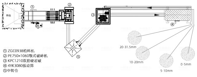 “鄂破+雙腔硬巖破”方案,成品花崗巖料粒型優于圓錐破,同傳統圓錐破配置相比,對于粒型要求較高的,可節省整形設備的投資。