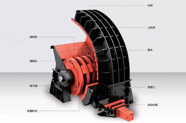 在物料進入箱式破碎機后,經(jīng)過高速旋轉(zhuǎn)的錘頭沖擊而進行破碎,破碎后的物料在錘頭處獲得動能,高速沖向破碎襯板,同時相互撞擊,經(jīng)過多次破碎,小于篩條之間間隙的物料,就會從間隙中排出,較大的物料在篩條上再次經(jīng)過錘頭沖擊,直到可以被排出。