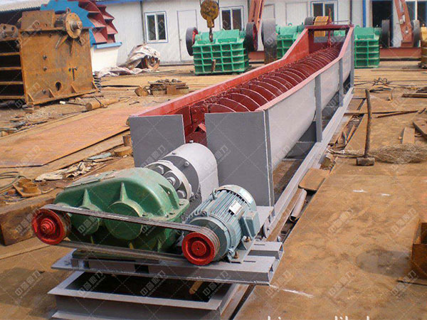 螺旋水洗沙機器由槽體、減速機、電機、軸、螺旋葉片、支架構成,支架焊接在軸上,螺旋葉片安好后用螺絲壓緊,使葉片不下垂不彎曲,