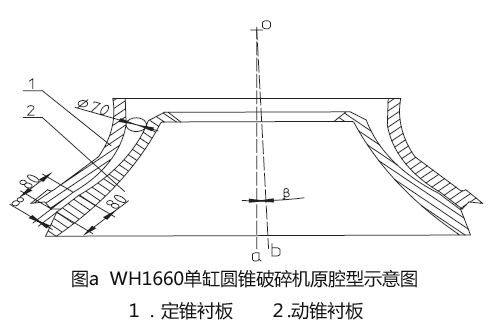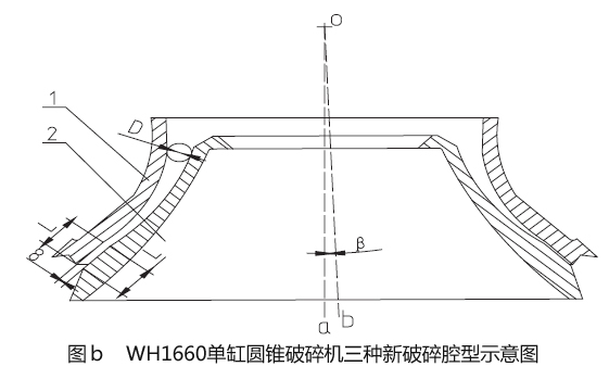 圓錐碎石機的腔型是決定設(shè)備細粒級含量的因素,我們決定對于WH1660單缸圓錐碎石機的粉碎型腔進行再次設(shè)計,以使該設(shè)備能符合f=12 的平均莫氏硬度巖石的生產(chǎn)要求。
