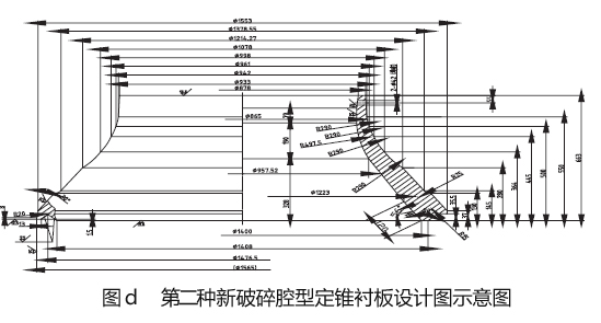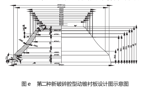 我們生產(chǎn)線設(shè)計小組用了半個月的時間設(shè)了三種新粉碎腔型(如圖b 所示,詳細數(shù)值見表c)。三種粉碎腔型相應(yīng)的不變襯板及動錐襯板的圖紙設(shè)計完畢后,立即投入了生產(chǎn)解決,并在三套新備件回來后,我們在連續(xù)三個襯板的采用周內(nèi),分別在平均莫氏硬度f=12 的鐵巖石整型破碎生產(chǎn)中試用了這三種腔型,在生產(chǎn)平均莫氏硬度f=12 的鐵巖石整型破碎生產(chǎn)時,由于粉碎腔型中平行粉碎帶斜長的增加,整型破碎效果越來越好,但過分增加,勢會引起整型破碎加工能力的指標要求。結(jié)合三種新式腔的采用效果,我們終采用了種型腔,與它相連的不變襯板及動錐襯板的效果圖分別如圖d、圖e 所示。