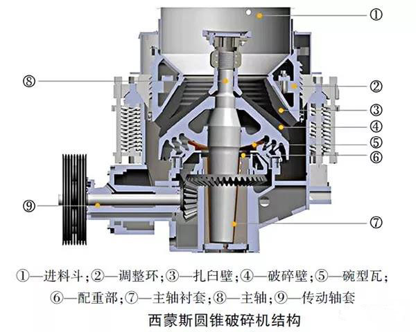 圓錐破碎機(jī)工作時(shí),電機(jī)的操作通過(guò)皮帶輪或聯(lián)軸器、圓錐碎石機(jī)驅(qū)動(dòng)軸和圓錐碎石機(jī)圓錐部在偏心套的迫動(dòng)下繞一周不變點(diǎn)作旋擺運(yùn)動(dòng)。從而使圓錐破碎機(jī)碎壁時(shí)而挨近,時(shí)而離開(kāi)固裝在調(diào)改套上的扎臼壁表面,使巖石在粉碎腔內(nèi)獲得沖擊,擠壓和彎曲影響而完畢巖石的破碎。