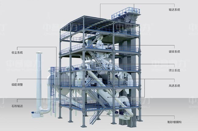 中譽鼎力樓式制砂機組成結構有全封閉皮帶機、立軸式沖擊式制砂機、振動篩、風選設備、收塵器、脈沖袋式除塵器、拌濕機、閉路循環風選系統、開路風選系統組成。