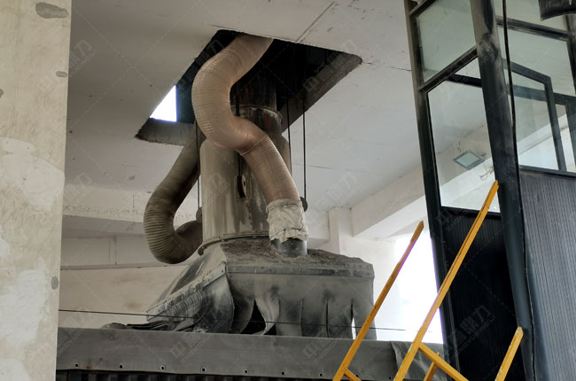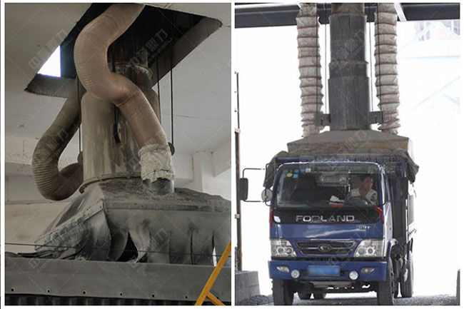 料倉自動放料裝車系統配用了一種砂石料無塵裝車裝置,包括卸料斗、升降控制裝、卸料筒體等,環保環節包括吸塵管、收塵器、伸縮套管等,吸料管設置在卸料筒體兩側,卸料口處有皮質吸塵罩抑塵,利于吸料管收集卸料揚塵。